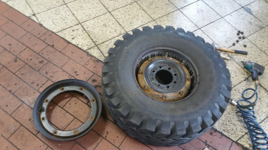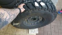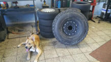 auf 12 Bolt HMMWV Felgen. 74Kg pro Rad!! Hierfür mussten die vorderen Kotflügel vorne und hinten je 5 cm gekürzt und wieder geformt/verschweißt werden.