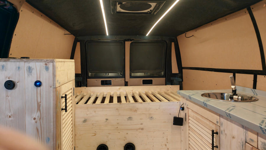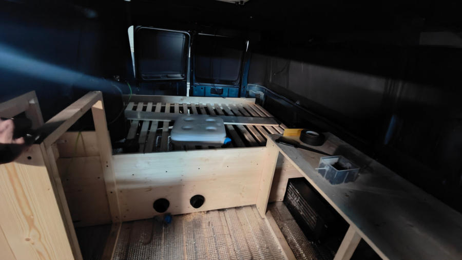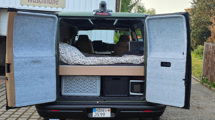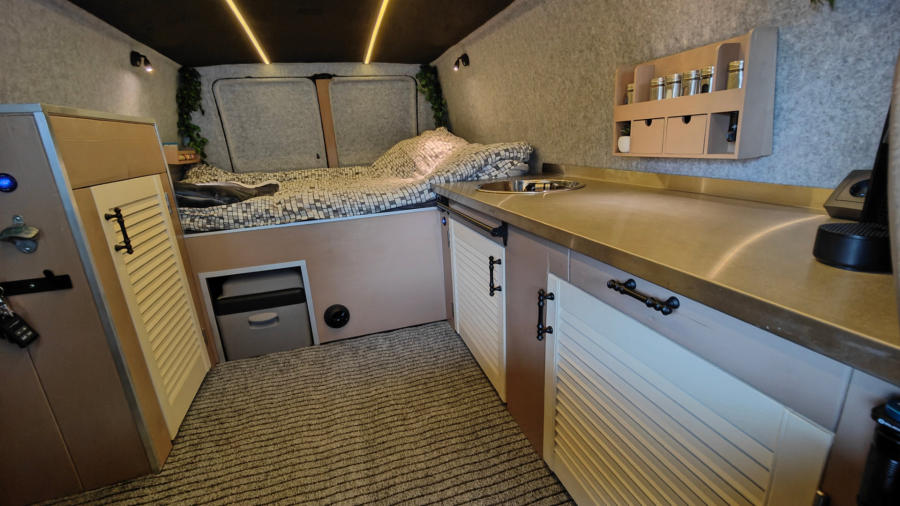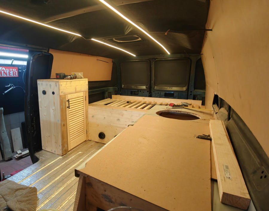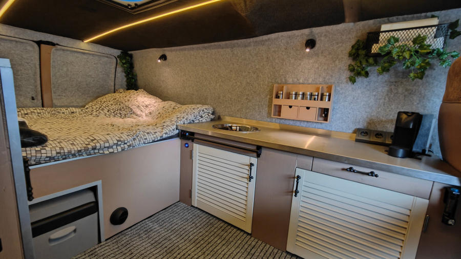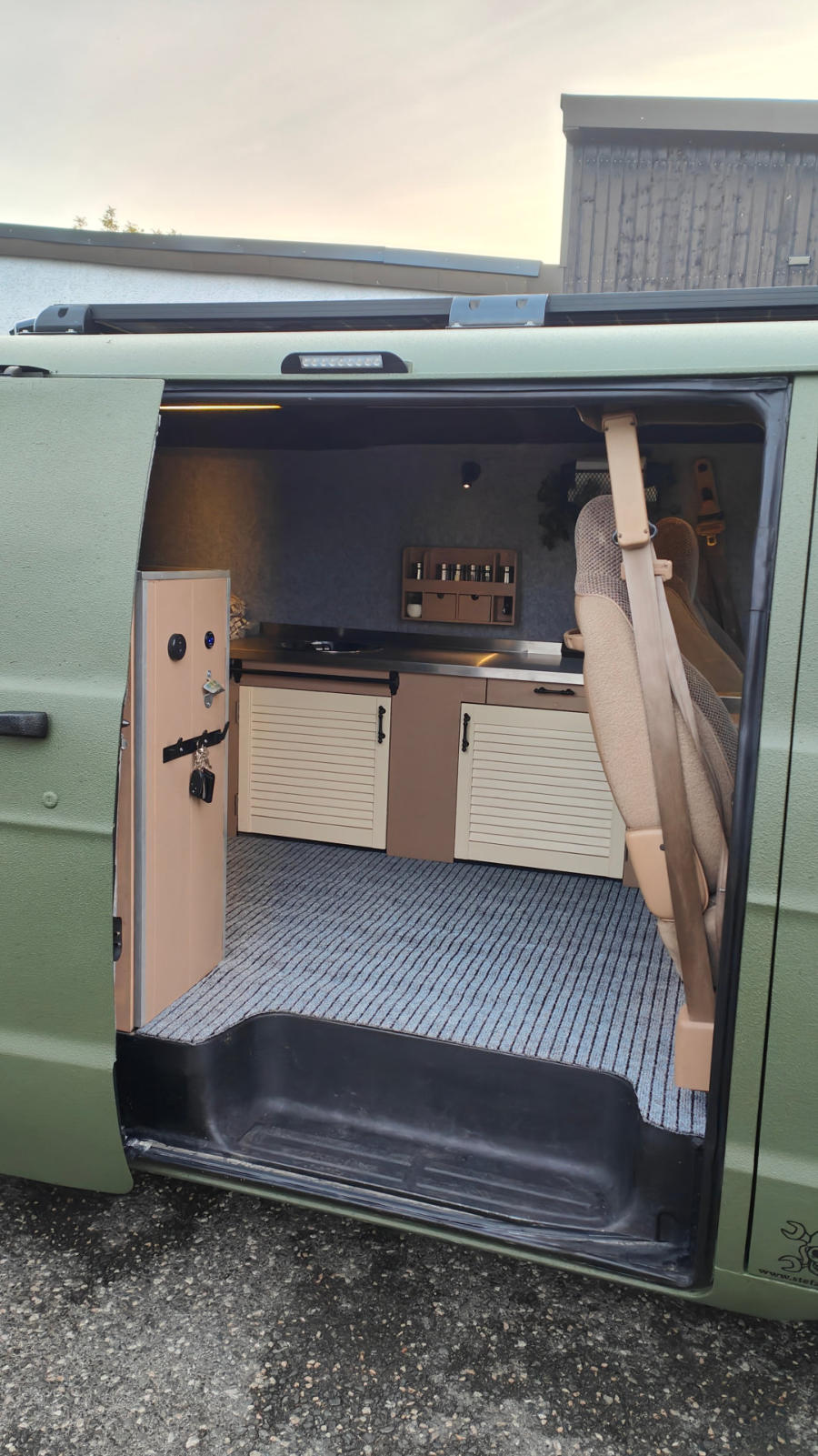 diverse 12 und 220V Steckdosen, Kompressorkühlschrank, mehrere USB PD Schnelladebuchsen, Reservekanister, Heckleiter, Teppichboden, Armaflex