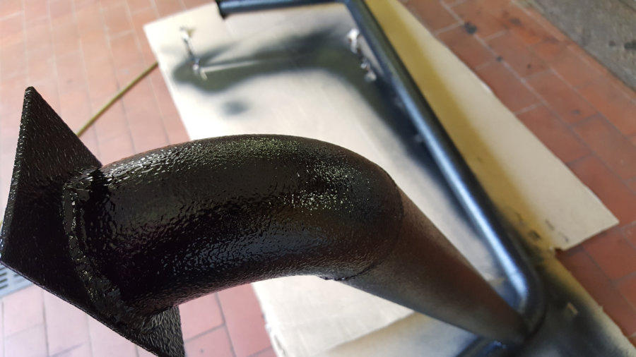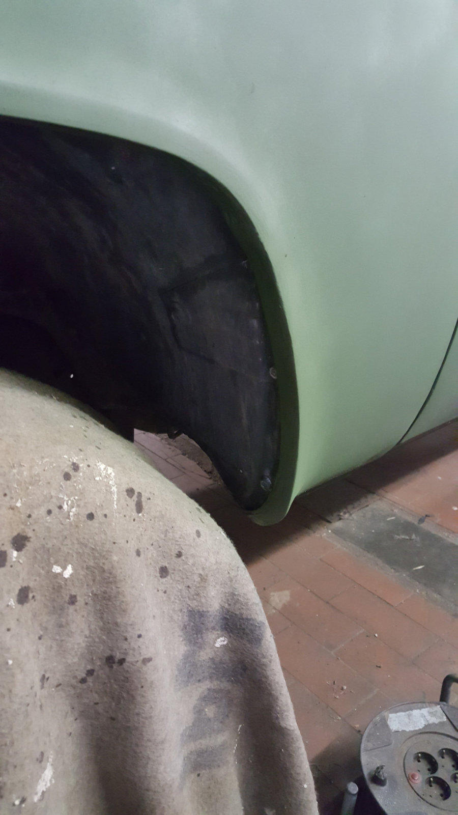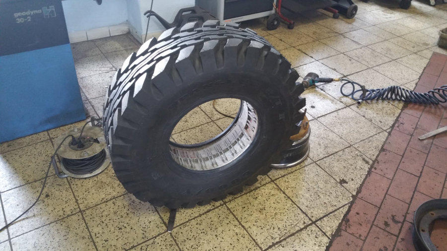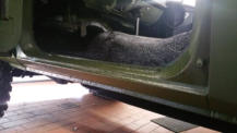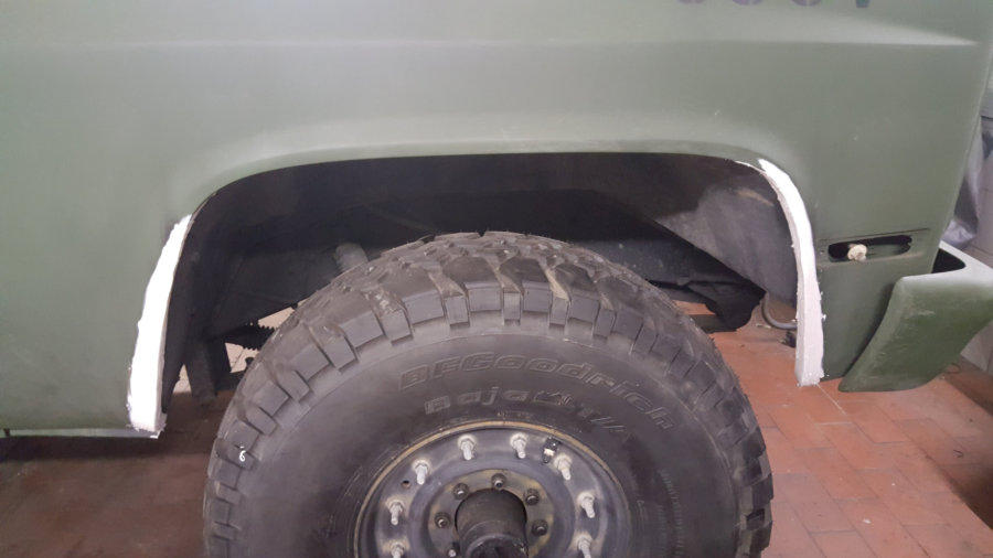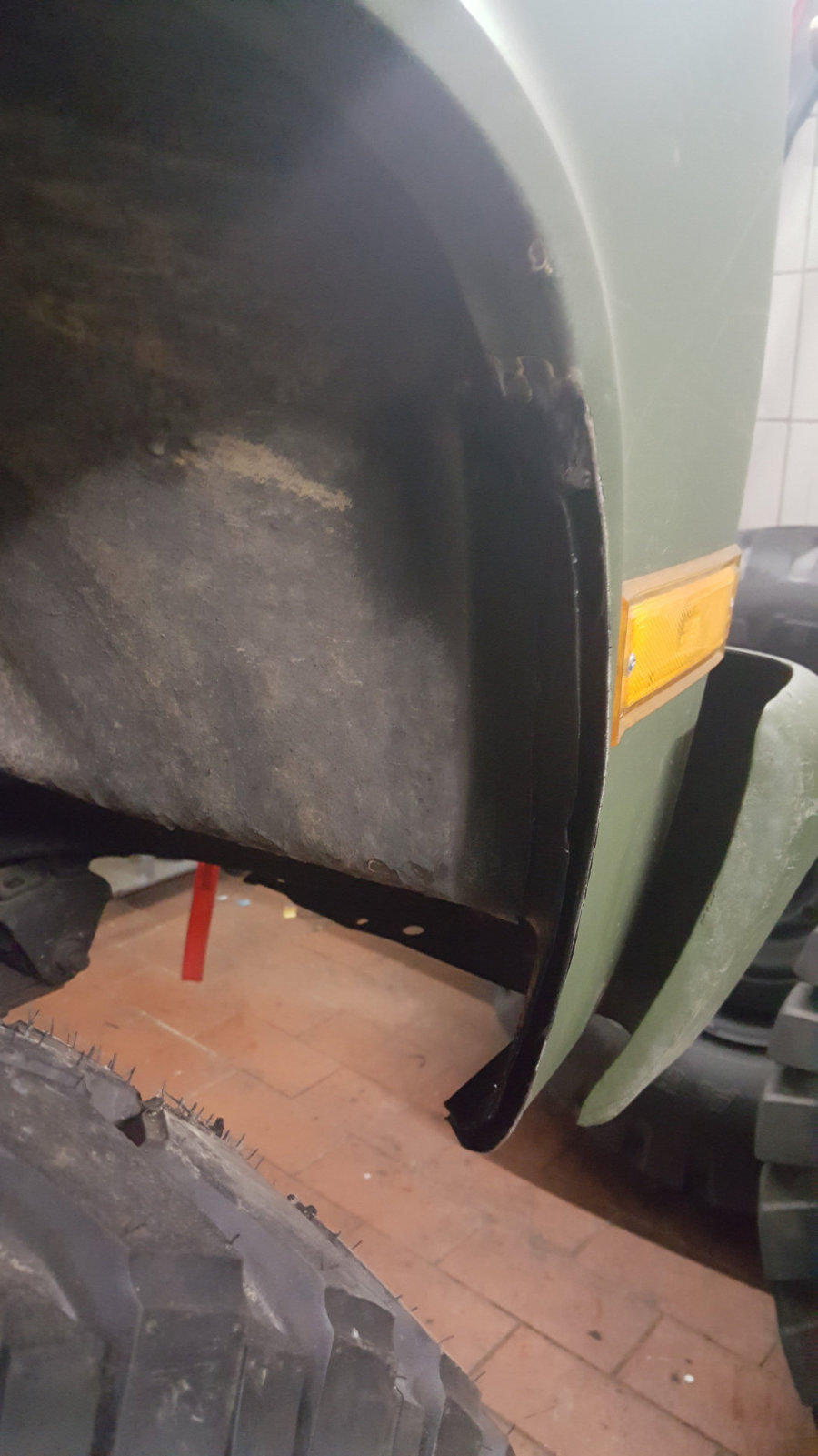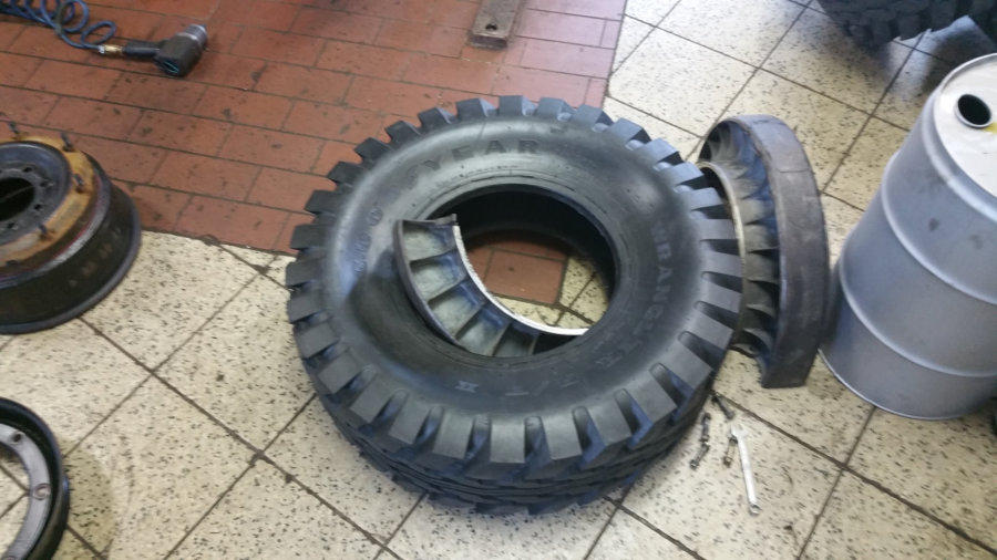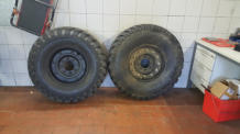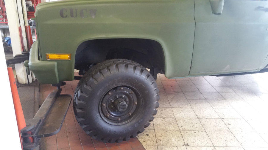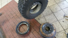 auf 12 Bolt HMMWV Felgen. 74Kg pro Rad!! Hierfür mussten die vorderen Kotflügel vorne und hinten je 5 cm gekürzt und wieder geformt/verschweißt werden.