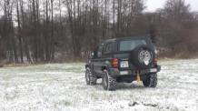 in angepasster Stahlstosstange, 33x12.5er MT Reifen auf 10x15 Felgen, Eigenbau Kabelbaum, Spatenhalterung, Spannungsanzeig, Ansaugsnorkel, Hardtop, englische